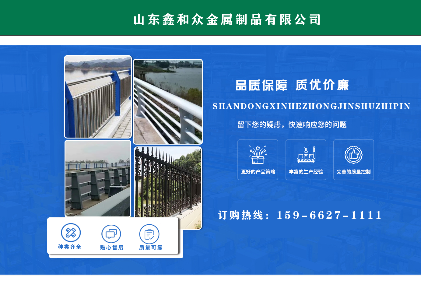 山東鑫和眾金屬制品有限公司主要產(chǎn)品有防撞護(hù)欄,橋梁護(hù)欄,道路護(hù)欄,河道護(hù)欄,不銹鋼護(hù)欄等護(hù)欄。提供設(shè)計(jì)方案,一站式定制,包您滿意價(jià)格優(yōu)惠,歡迎來電咨詢!    公司常年從事銷售護(hù)欄防撞護(hù)欄,橋梁護(hù)欄,道路護(hù)欄,河道護(hù)欄,不銹鋼護(hù)欄,橋梁鋼護(hù)欄,河道燈光護(hù)欄等。產(chǎn)品廣泛應(yīng)用于橋梁、河道、旅游景區(qū)、道路、公路、公園、小區(qū)、景觀、道路防撞等領(lǐng)域。    公司產(chǎn)品均采用優(yōu)質(zhì)不銹鋼材料,符合相關(guān)標(biāo)準(zhǔn)。各種型號(hào)不銹鋼復(fù)合管及護(hù)欄,質(zhì)量嚴(yán)格把控。產(chǎn)品強(qiáng)度高、耐腐蝕、焊接牢固、抗沖擊、性能好,防撞護(hù)欄結(jié)構(gòu)簡(jiǎn)單、美觀實(shí)用大方。     歡迎前來訂購!...